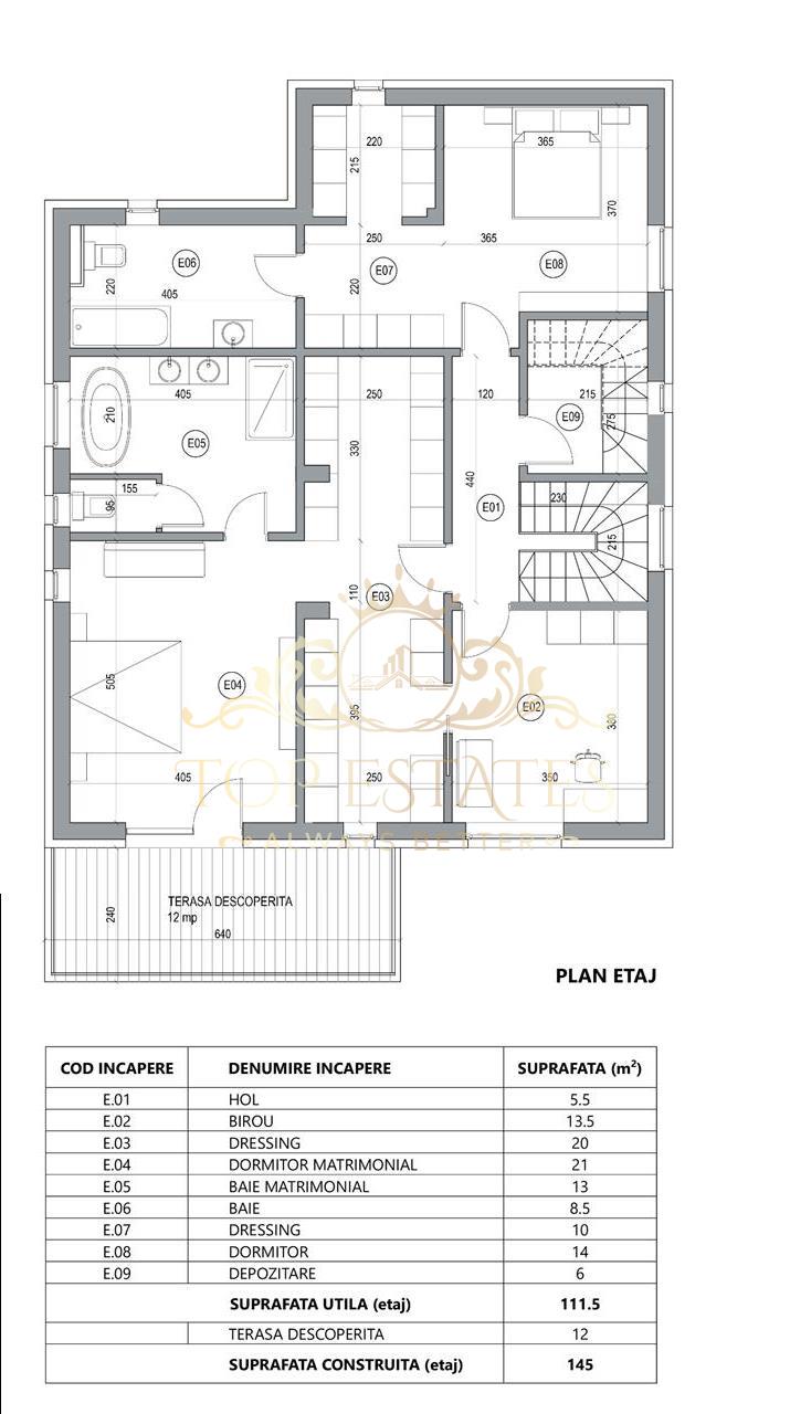 La etaj sunt doua dormitoare matrimoniale, fiecare cu dressing si baie proprie. Dormitorul matrimonial orientat spre sud beneficiaza si de o terasa, iar baia acestuia este conectata cu spalatoria de la parter printr-un tub de rufe. Tot la etajul 1, langa dormitorul matrimonial orientat spre sud, mai este o camera ce poate fi folosita ca birou, camera de lectura sau camera pentru un nou nascut.