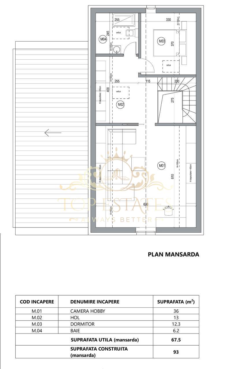 La mansarda se regaseste un spatiu locativ luminos, tip apartament, cu o camera de zi / joaca (hobby), un dormitor, spatii depozitare si baie cu ventilatie naturala prin intermediul ferestrelor Velux.